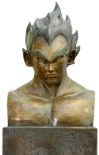 Manga Bronze, 2003 / 2004, ca 190 cm hoch Diese Skulptur stellt einen Königssohn dar. Im Augenblick der Abbildung befindet er sich in der Phase der Metamorphose vom Jüngling zum Mann, einer ultimativen Superkampfmaschine mit überirdischen Kräften und phantastischen Fähigkeiten ausgestattet. Vom Kinn bis Nasenansatz Kind. Die Augen und alles andere seiner Gestalt ist Mischwesen, ähnlich den Kentauren aus der griechichen Mythologie.